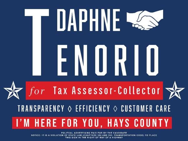 My name is Daphne Tenorio. I am running to be your new Hays County Tax Assessor Collector. My decision to run for this office is driven by my passion to serve every citizen in Hays County in an equitable, transparent, and efficient manner. I believe the Tax Assessor-Collector, as well as being a good administrator, should serve as a taxpayer advocate and educate the public on how the taxing process works.