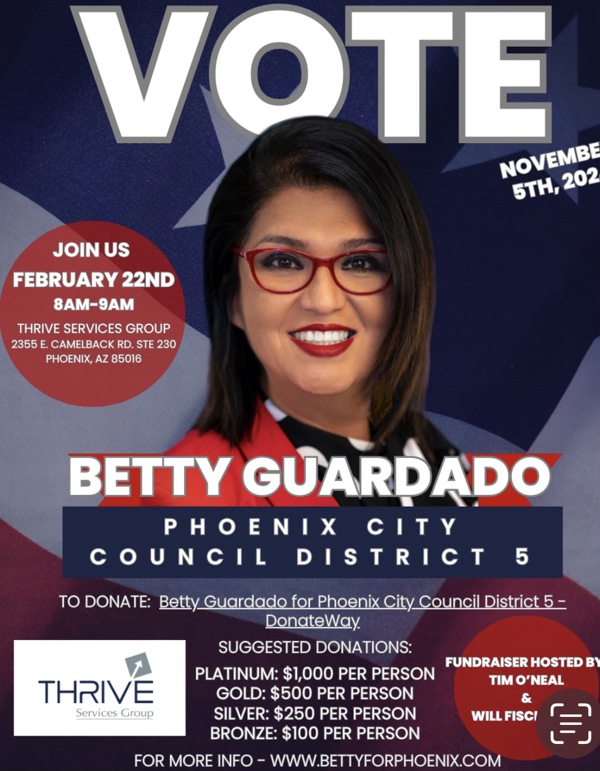 Join Tim O'Neil and Will Fishchbach on Thursday February 22nd at 8am for a Meet & Greet with Phoenix City Councilwoman Betty Guardado! We will be hosting at Thrive Services Group - 2355 E Camleback Rd, Ste 230 Phoenix, AZ 85016. We encourage you to RSVP by making a contribution or sending an email to betty4phoenix@gmail.com. Checks should be payable to 'Betty for Phoenix.'