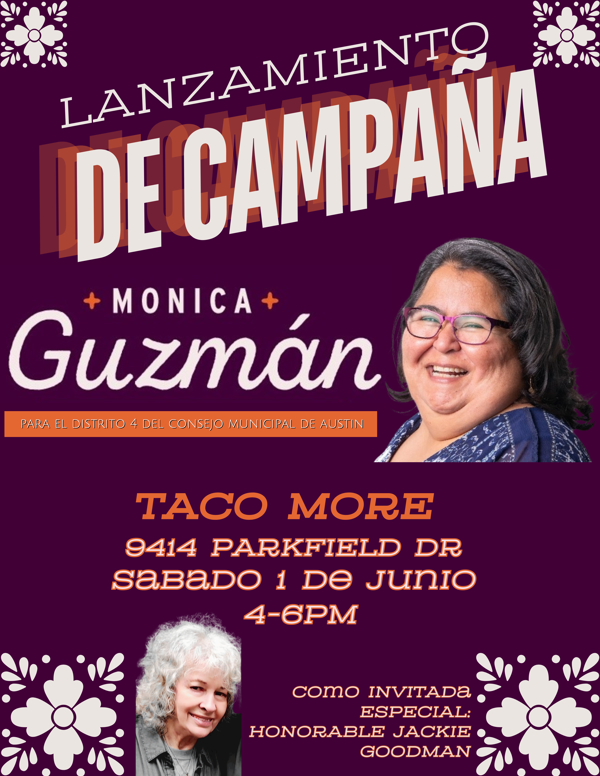 Pol. adv. pagado por la Campaña de Monica Guzmán. Tesorera: La Honorable Jackie Goodman. Esta campaña no ha aceptado cumplir con los límites de contribuciones y gastos de la Ordenanza de Campaña Justa de Austin.