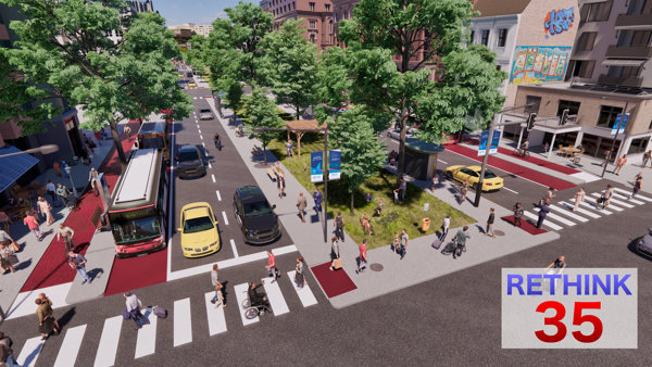 Rethink35 is a grassroots campaign to transform I-35 through Austin into a boulevard with wide sidewalks, protected bicycle lanes, bus lanes and regional trains, local businesses, iconic music venues, and affordable housing. More information.