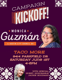 Pol. Ad. paid for by Monica Guzmán campaign. The Honorable Jackie Goodman, Treasurer. This campaign has not agreed to comply with the contribution and expenditure limits of the Austin Fair Campaign Ordinance.