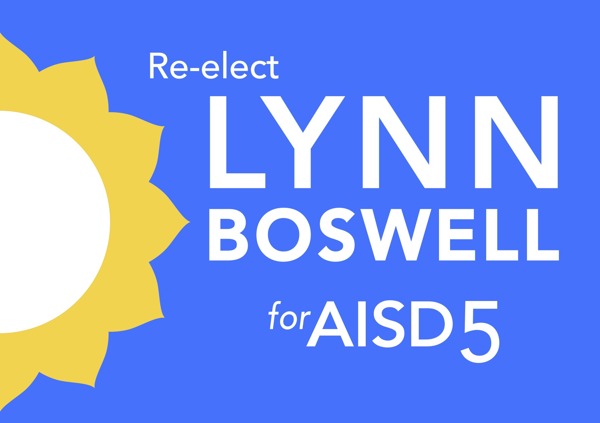 Thank you for investing in the future of our students and our city by helping to re-elect Trustee Lynn Boswell for AISD's District 5. Lynn has proven herself as a strong and strategic leader for Austin ISD at a crucial time for public education - in our city and in our state.