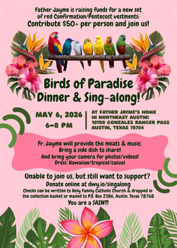 Checks can be written to Holy Family Catholic Church & dropped in the collection basket or mailed to P.O. Box 2386, Austin, Texas 78768.