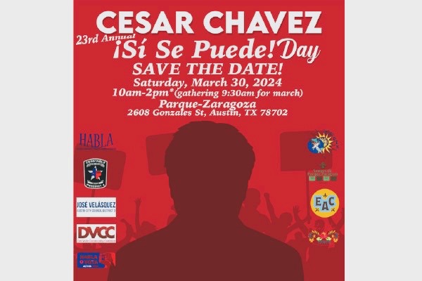 Join us for the 23rd Annual ¡Sí Se Puede! César Chávez March & Day of Action! Saturday, March 30, 2024, 10am -2pm (gathering for march at 9:30am), Parque Zaragoza, 2608 Gonzales St., Austin, TX 78702