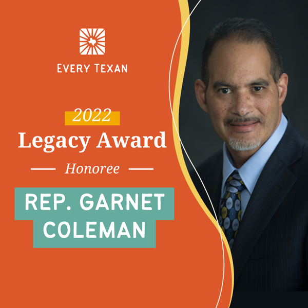 Every Texan is honored to announce Representative Garnet Coleman as the 2022 Legacy Award recipient. Now more than ever, our state needs champions for policy priorities that keep Texans healthy and safe.