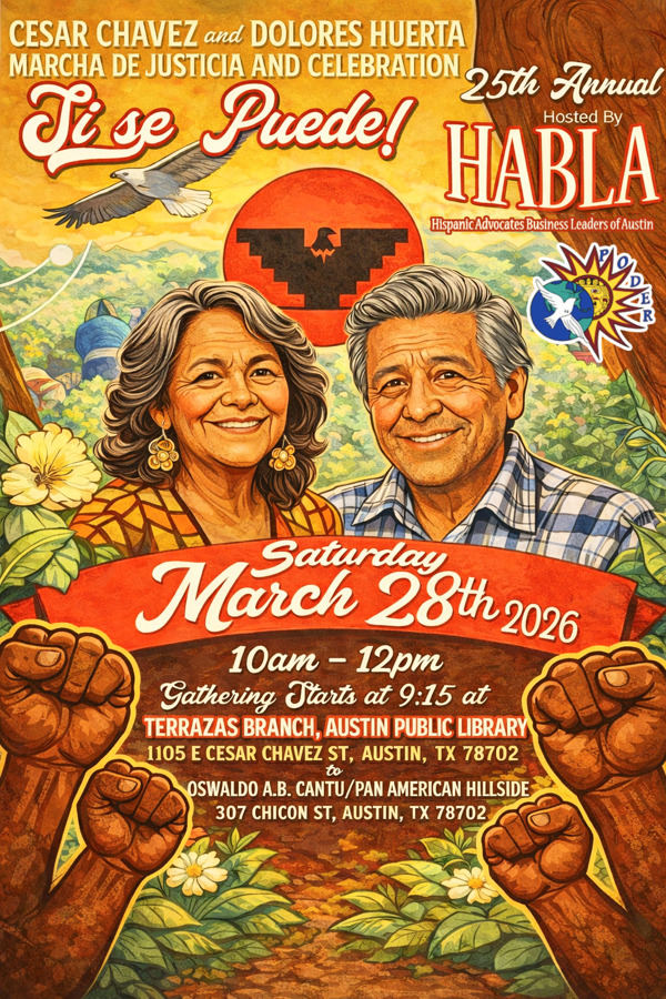 Join HABLA for the 25th Annual César Chávez and Dolores Huerta Marcha de Justicia and Celebration on Saturday, March 28, 2026, 10am to 12pm. Gathering at 9:15am Terrazas Library Rayo de Esperanza/César Chávez Memorial Sculpture located at 1105 E. César Chávez Street march to AB Cantu/Pan Am Hillside located at 307 Chicon Street.