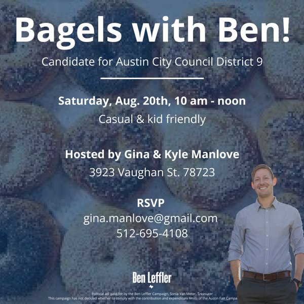 Join Mueller neigbors to enjoy some bagels and discuss Ben's campaign for Austin City Council District 9.