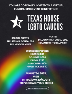 Your support helps fund the Texas House LGBTQ Caucus' policy and legal work, as well as its fellowship program, which works constantly to protect the dignity and rights of LGBTQIA+ Texans.